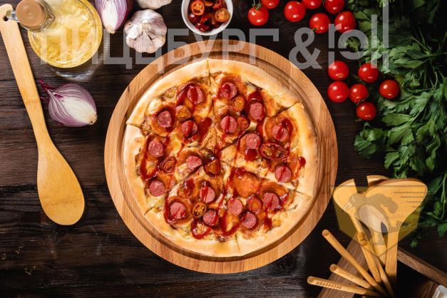 Тонкое тесто, колбаски пепперони, охотничьи колбаски, халапеньо, соус фирменный острый, соус шрирача, сыр моцарелла (острая)