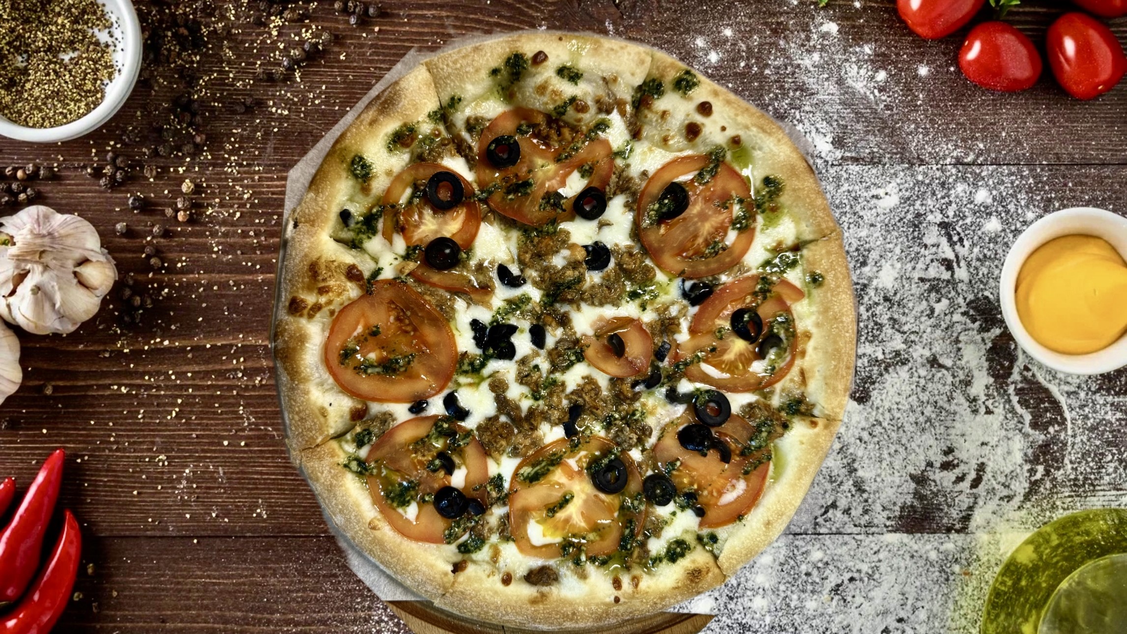 Тонкое тесто, фирменный сливочный соус, моцарелла, жареный лосось, томаты, маслины, соус песто