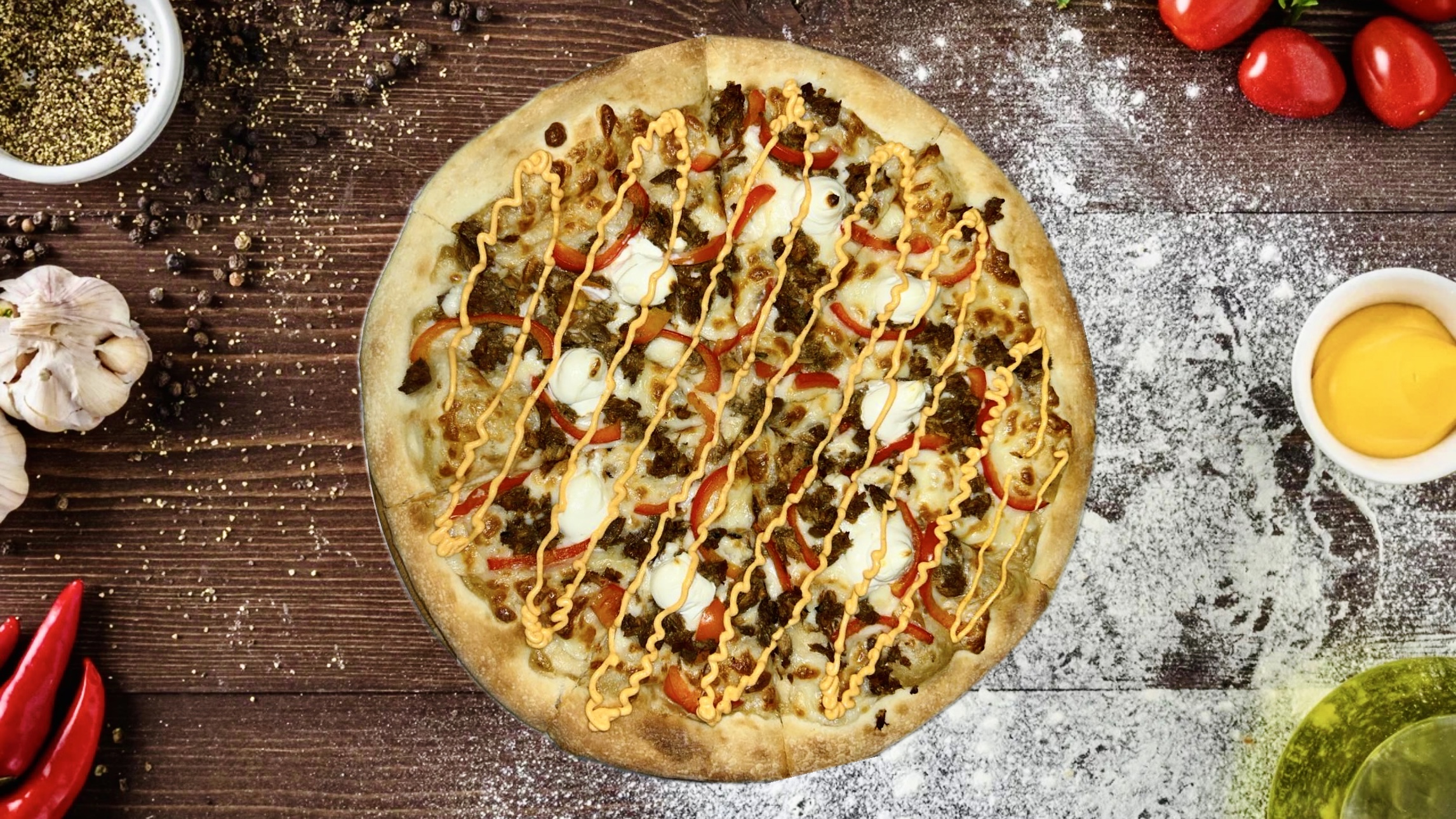 Тонкое тесто, соус цезарь, моцарелла, жареный лосось, болгарский перец, сыр креммете, соус спайси