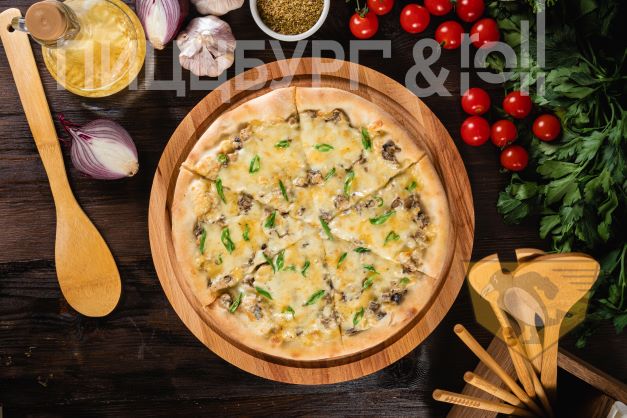 Тонкое тесто, сыр моцарелла, соус сливочный, курица, шампиньоны, лук репчатый, зеленый лук