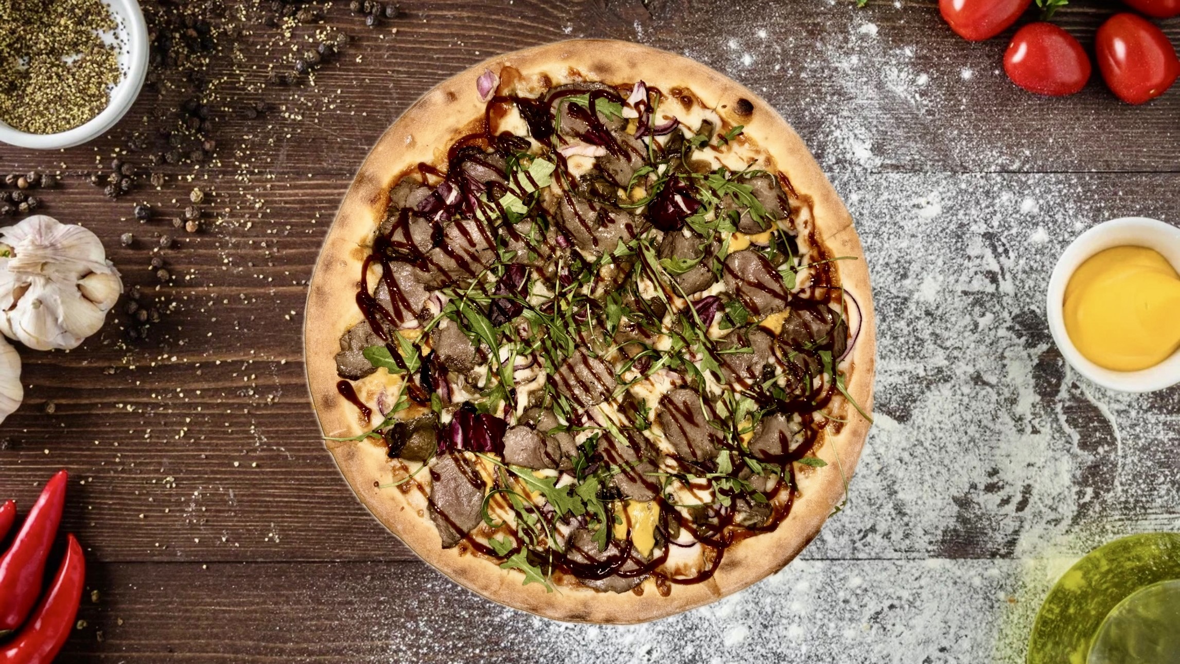 Тонкое тесто, фирменный соус, моцарелла, ростбиф из говядины, сыр чеддер, грибная смесь, лук красный, лук фри, соус барбекю