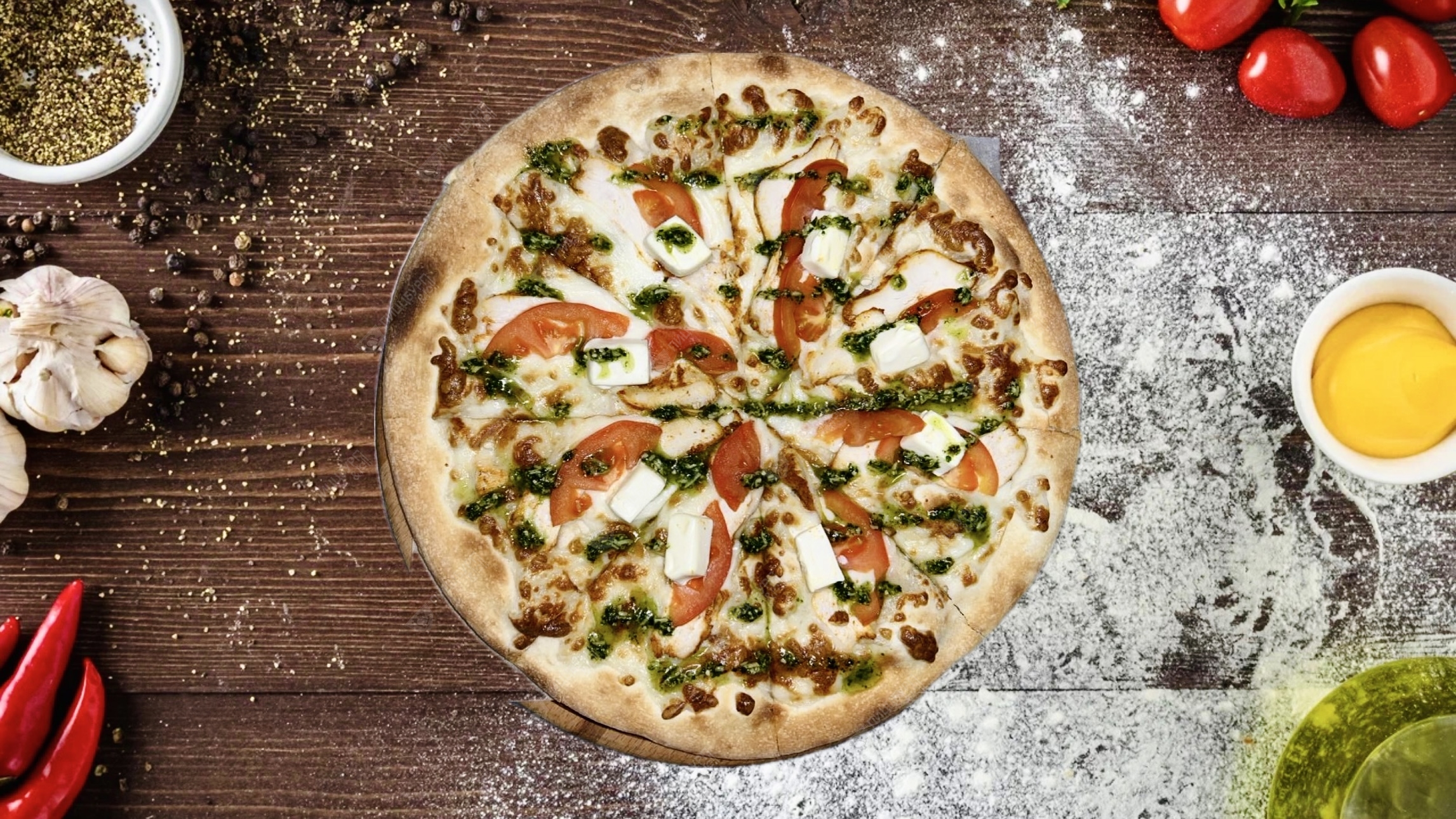 Тонкое тесто, фирменный сливочный соус, моцарелла, курица, томаты, сыр фетакса, соус песто