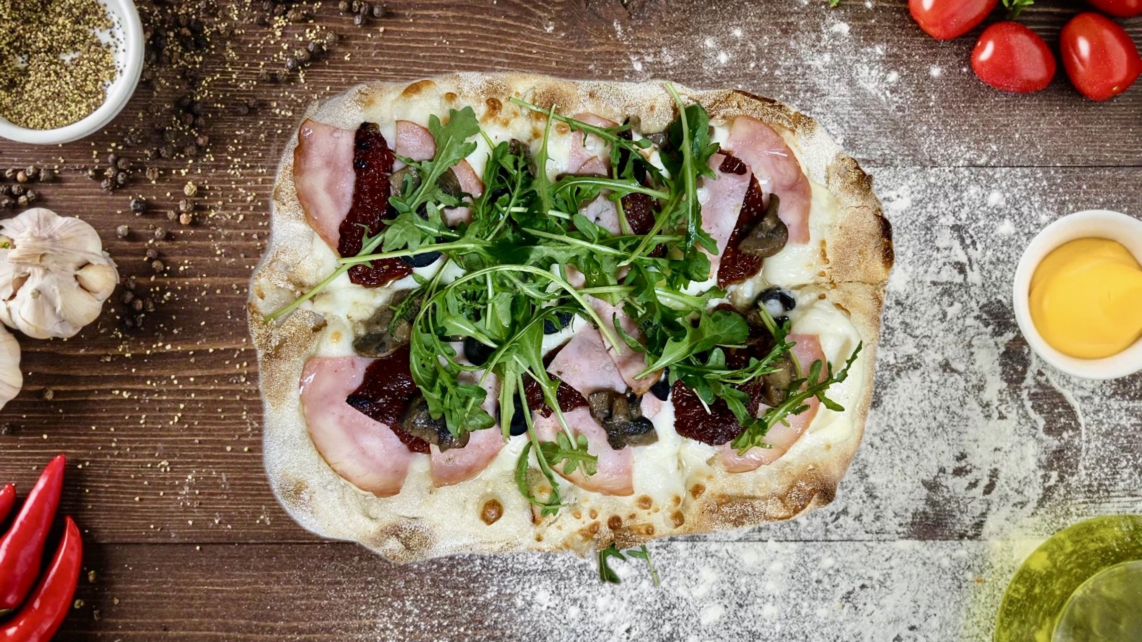 Фирменный сливочный соус, моцарелла, ветчина, вяленые томаты, грибная смесь, оливки, чесночное масло, зелень