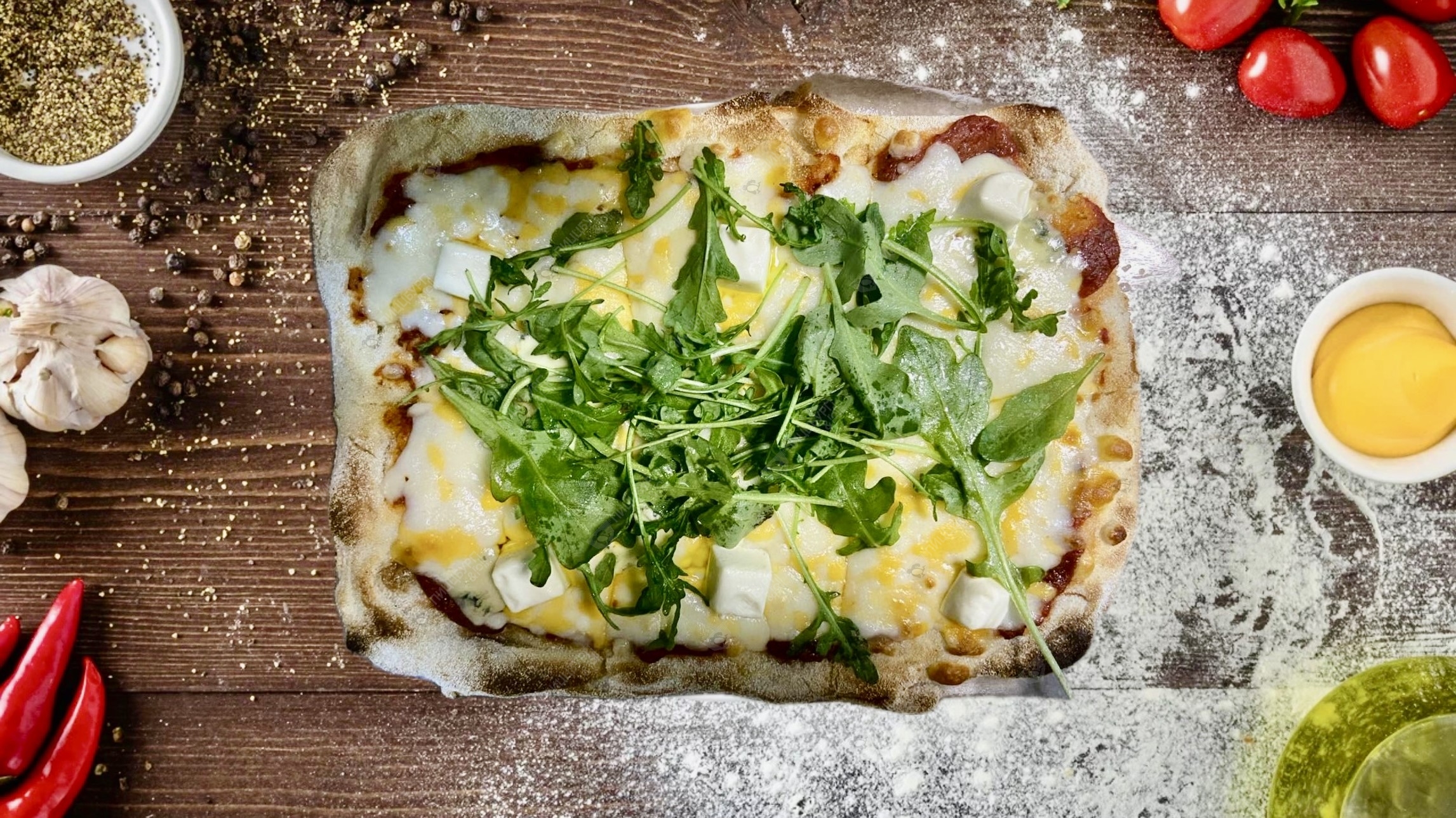 Томатный соус, сыр моцарелла, сыр чеддер, сыр дор блю, сыр сулугуни, сыр пармезан, фетакса, зелень