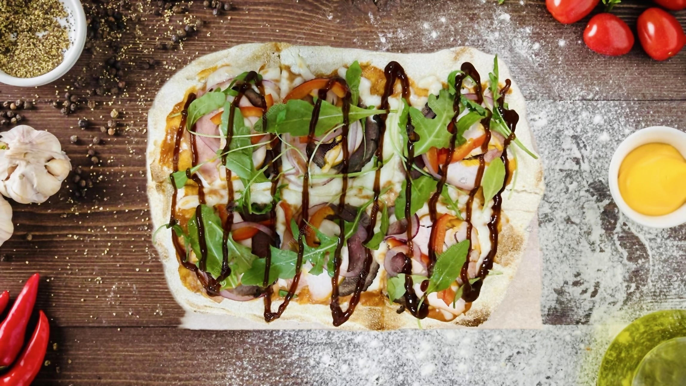 Фирменный соус, моцарелла, маринованный ростбиф, ветчина, копченая курица, перец болгарский, лук красный, соус барбекю, зелень
