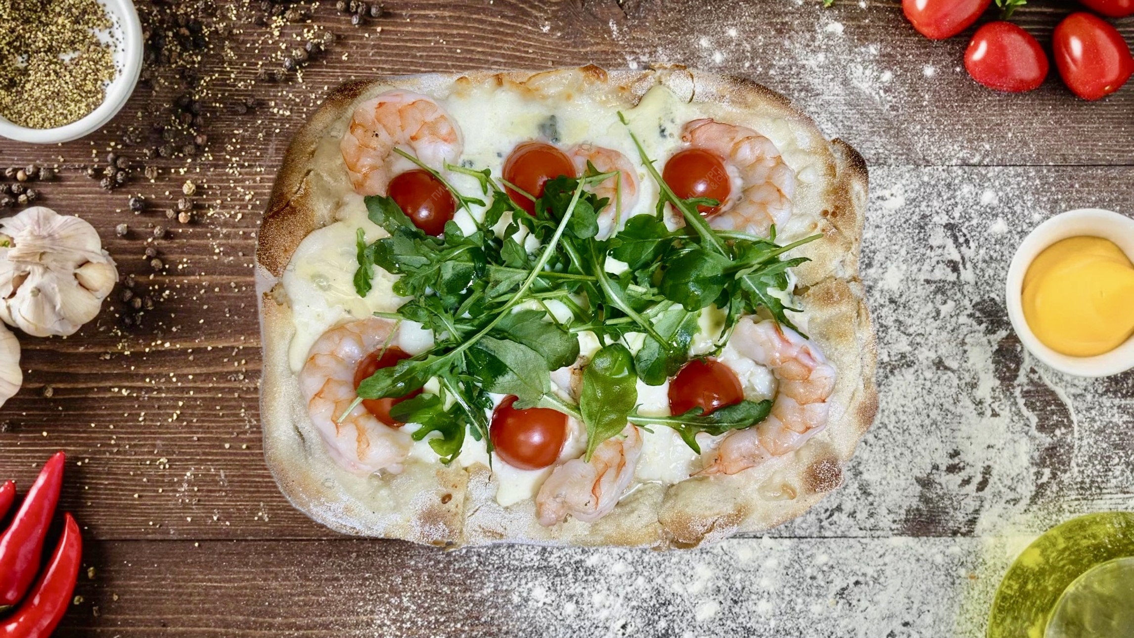 Фирменный сливочный соус, моцарелла, креветки, томаты, сыр дор блю, соус песто, зелень