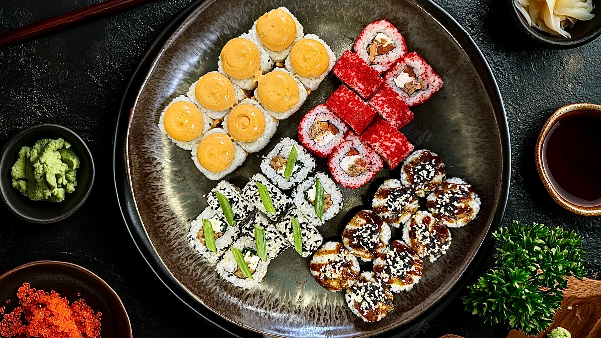 - Сяки Яки (рис, нори, жареный лосось, зеленый лук, творожный сыр, кунжут)