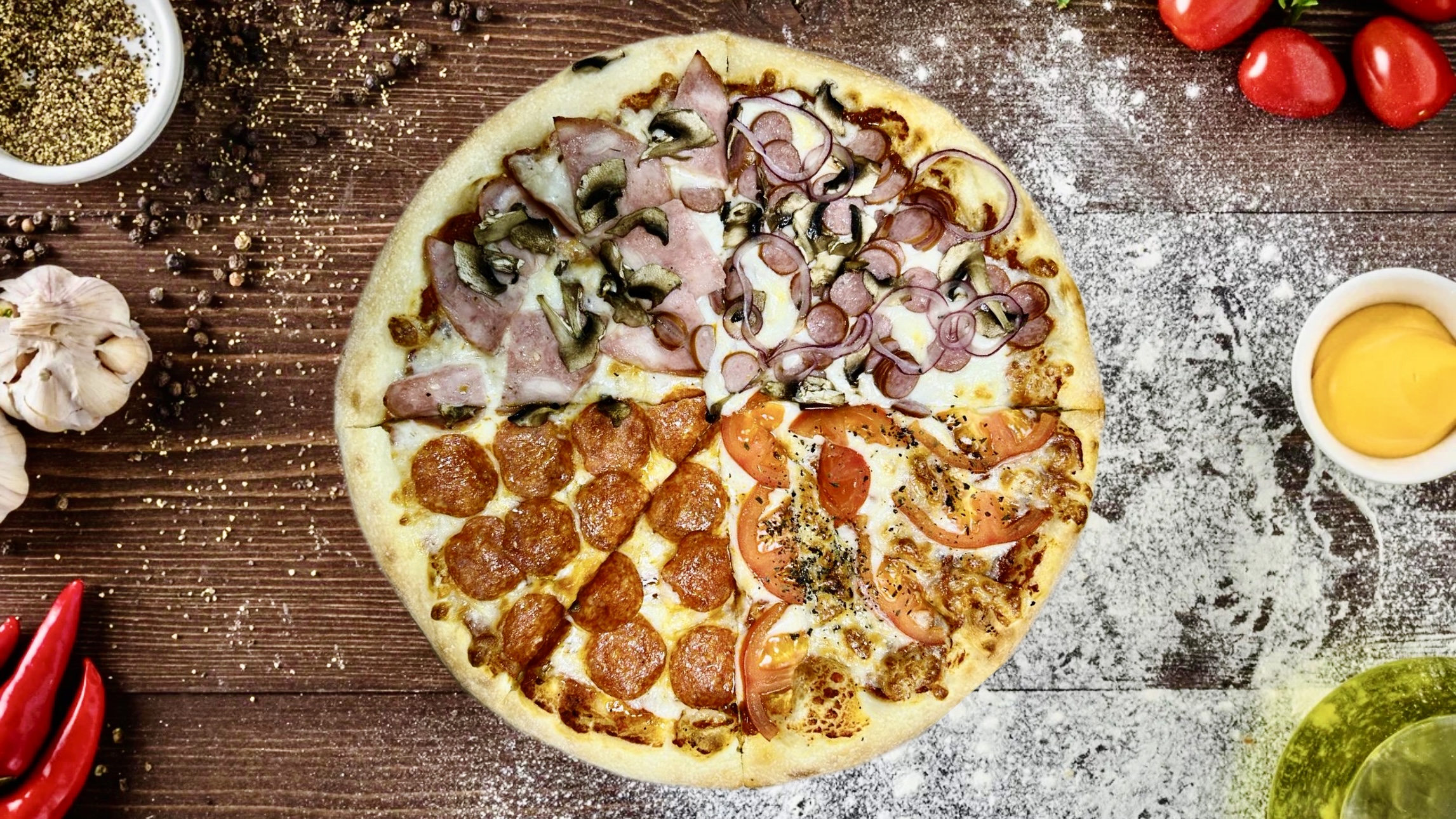 4 вкуса в одной пиццеПепперони, Маргарита, Ветчина грибы, Охотничьяна выбор 35 см или 40 см