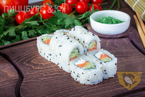 рис, нори, лосось, кунжут, нежный сливочный сыр , огурец.
