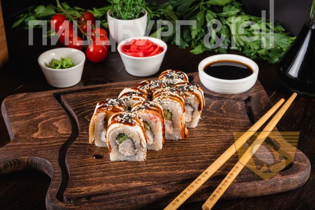 Рис, нори, огурец, креветка, сливочный сыр, угорь, соус унаги, кунжут Осторожно в угре могут быть мелкие косточки!!! 280 грамм