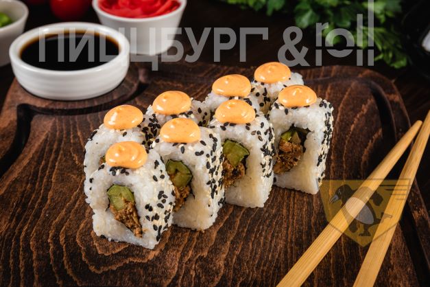 рис, нори, жаренный лосось, болгарский перец, соус спайси (Острый), кунжут Эти роллы с пикантной остринкой!!! 250 грамм