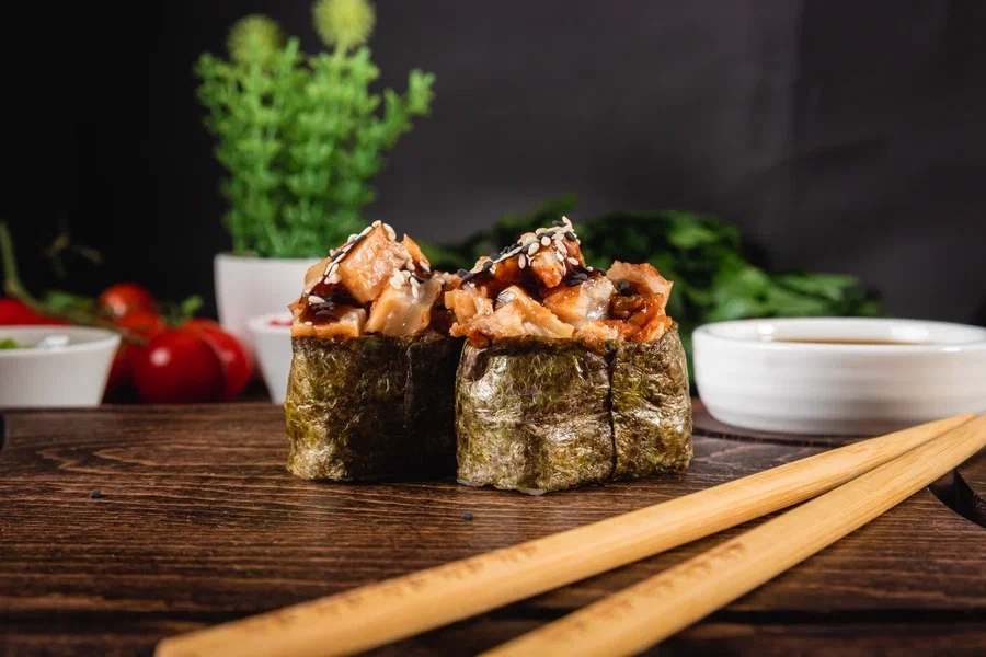 Ломтики угря на подушке из риса, обернут в лист нори.