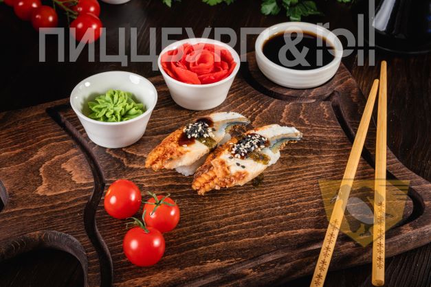Копченый угорь на подушке из риса, украшенный соусом унанги и кунжутом. 60 грамм